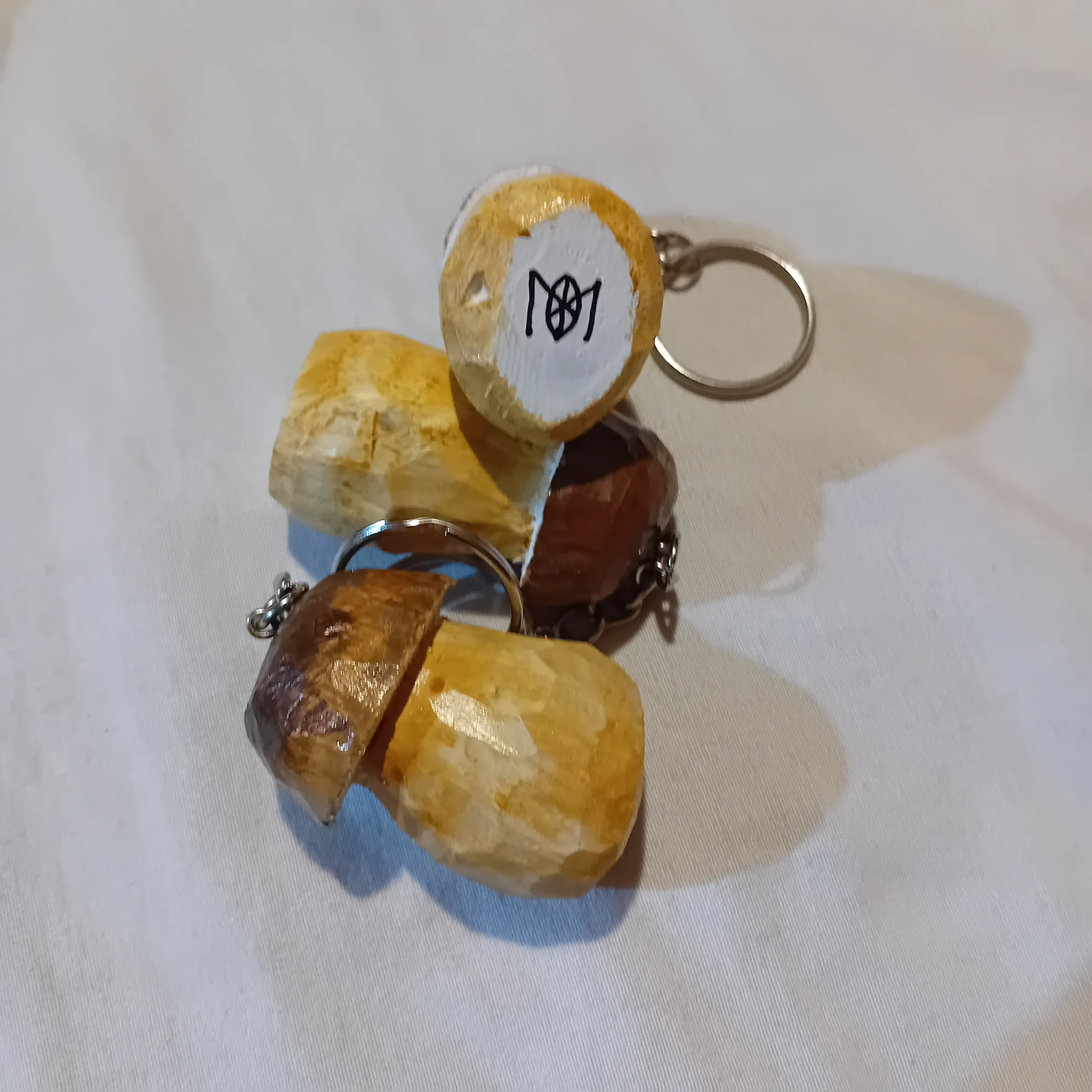 A unique wooden keychain, hand-carved from a single piece of wood, inspired by the shape and natural charm of the king bolete (Boletus edulis).